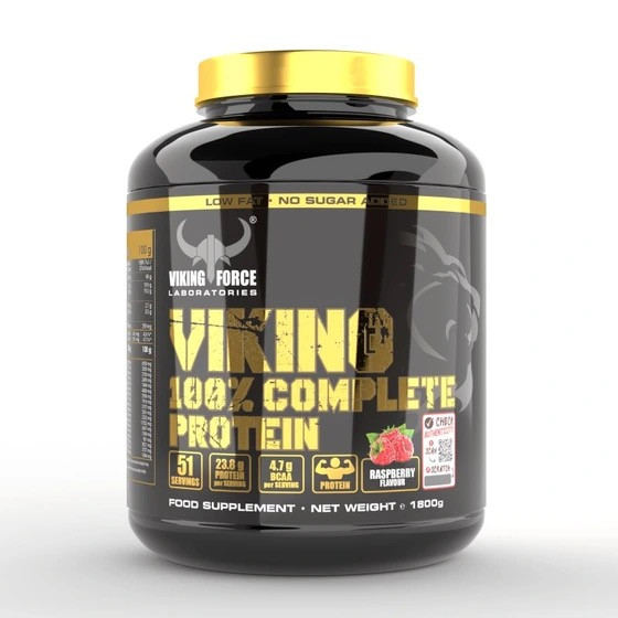 پروتئین کامپلیت وایکینگ فورس Viking Force 100% COMPLETE PROTEIN دارای وزن 1800 گرمی است و یک مکمل غذایی مناسب برای ورزشکاران است چون حاوی پروتئین هیدرولیز شده گندم و پروتئین ایزوله سویا است که به شکل پودر با حلالیت فوری درآمده است. پروتئین به رشد و حفظ توده عضلانی کمک می کند.