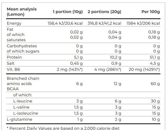 | Branched chain amino acids BCAA * | 6 g | 12 g | 60 g |